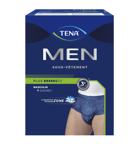 Gardez un style de vie actif en dépit des fuites urinaires avec les sous-vêtements absorbants TENA Men Active Fit. Les sous-vêtements TENA Men Active Fit Pants Plus en bleu marine ressemblent à un sous-vêtement classique, avec une coupe masculine, une ceinture élastique et une matière respirante semblable au coton. Soyez confiant et gardez le contrôle. Ces sous-vêtements absorbants pour hommes sont discrets et s’ajustent facilement. La zone d’absorption sécurisée capture instantanément les fuites. Vous bénéficiez d’une triple protection contre les fuites, les odeurs et l’humidité. Ainsi, que vous ayez besoin d’être impeccable pour le travail, à la salle de sport ou en sortie, vous gardez le contrôle avec TENA Men.